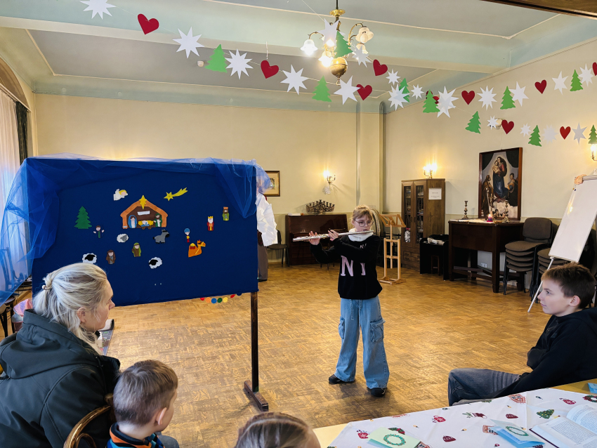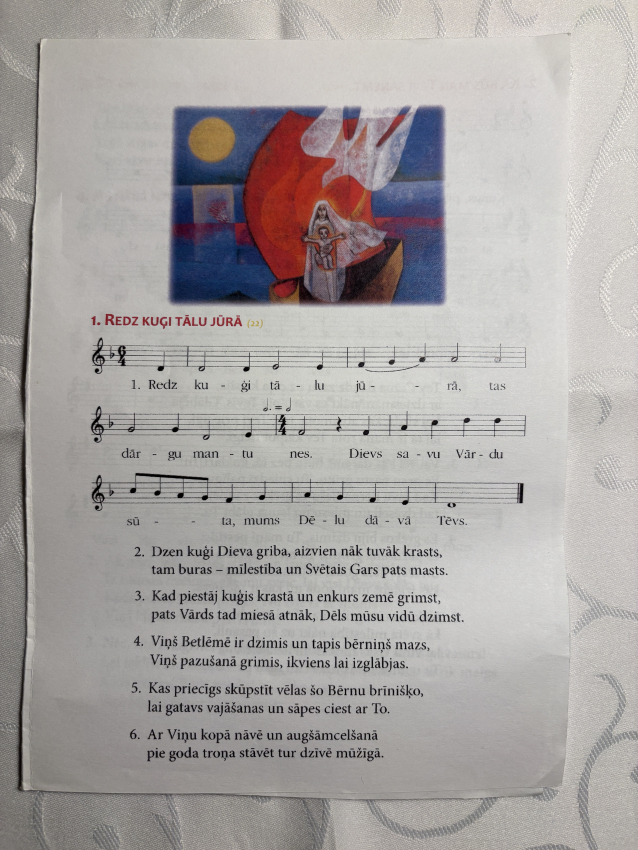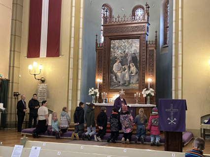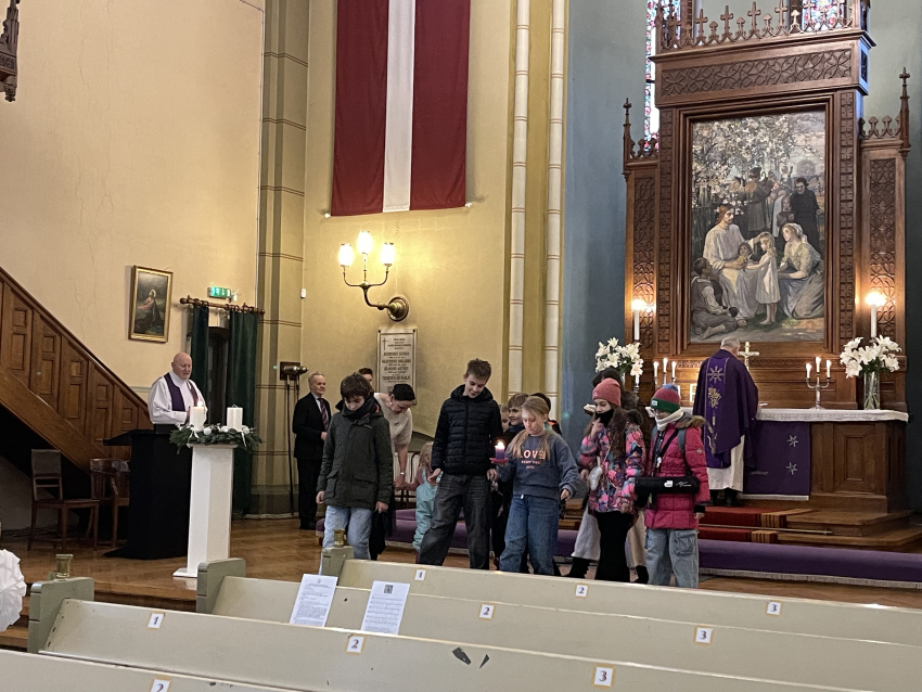 Pirmā svecīte Adventa vainagā deg ar cerības liesmiņu, bērni dzied dziesmu "Redz kuģi tālu jūrā". Mācītājs Guntars sniedz Kristus mīlestības pilno sveces liesmiņu Jauno Baznīcas gadu uzsākot.