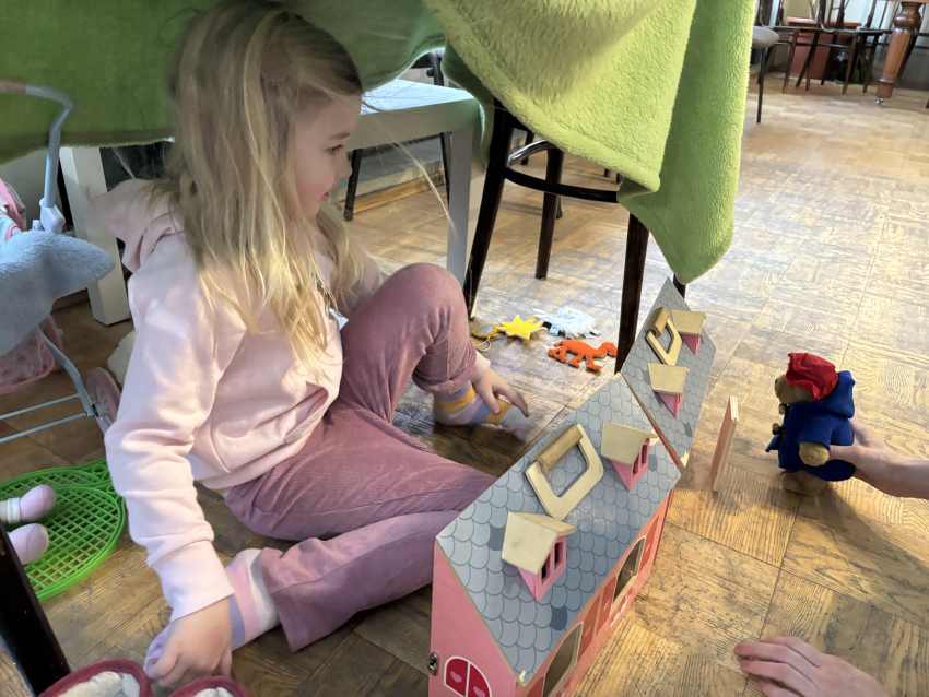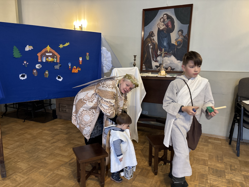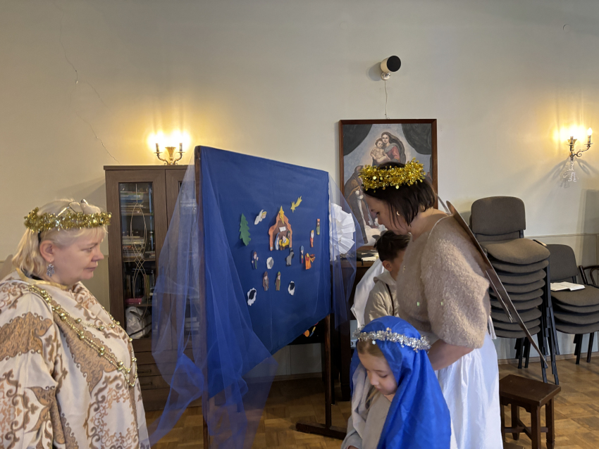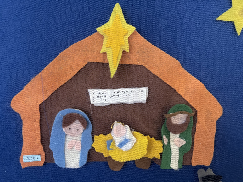 Tur ganiņi ienāk, un ceļos tie krīt, un gaisā dzied eņģeļi: Dievs pie jums mīt.