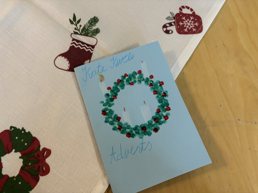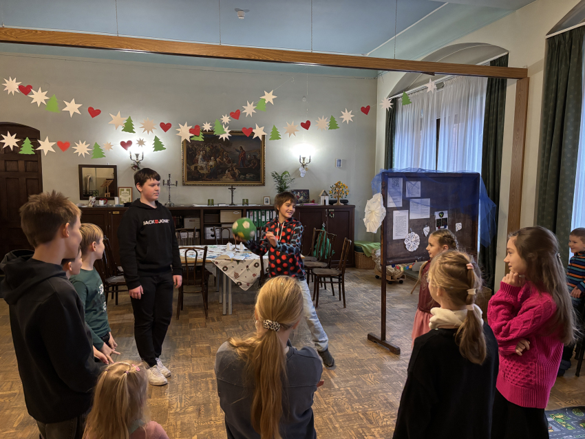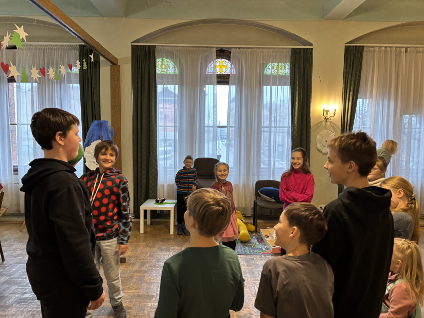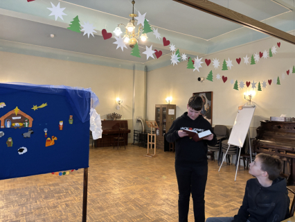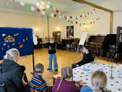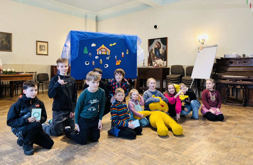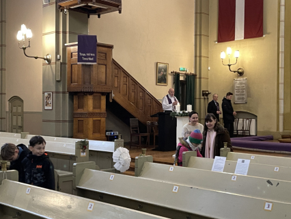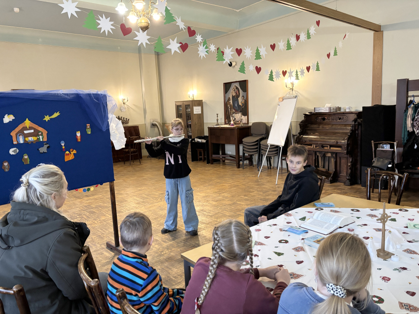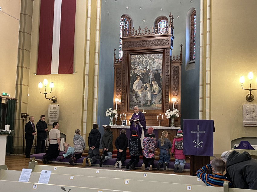 Pirmā svecīte Adventa vainagā deg ar cerības liesmiņu, bērni dzied dziesmu "Redz kuģi tālu jūrā". Mācītājs Guntars sniedz Kristus mīlestības pilno sveces liesmiņu Jauno Baznīcas gadu uzsākot.