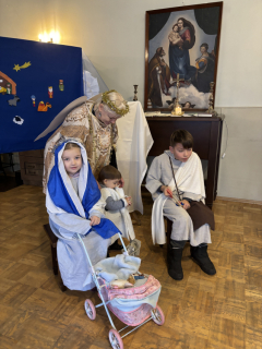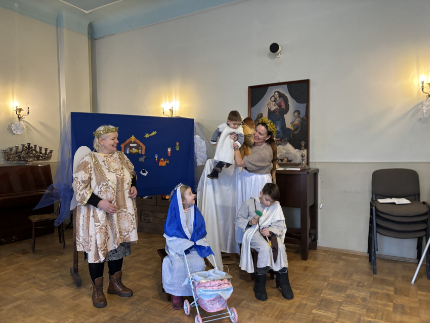 Tur ganiņi ienāk, un ceļos tie krīt, un gaisā dzied eņģeļi: Dievs pie jums mīt.