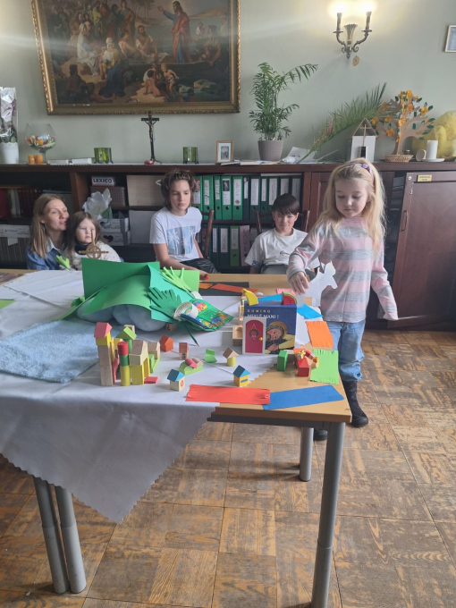 Palmu/Pūpolu svētdiena Baznīcā. Šajā svētdienā mēs pieminam Jēzus ierašanos Jeruzalemē. Tā bija gaviļu diena. Arī Svētdienas skoliņā būvējam pilsētu ar kalnu, ieklausāmies Dieva Vārdā. Kopīgi izejam pretī ar palmu zariem, pūpoliem, maziem paklājiem, ēzelīti no papīra. Amanda ved ēzelīti, Kārlis un Matīss būvējuši pilsētu ar kalnu un ieleju, Grieta ar māmiņu palīdzējušas likt ceļu, skolotāja Ilze ved cauri Bībeles stāstu lappusēm. Atklājas notikumi tik dzīvi! Palmu svētdiena ievada Kluso nedēļu ar Pēdējām Vakariņām ceturtdienā, lūgšanām Olīvu dārzā, ar Lielo Piektdienu, kad Jēzum bija jāpanes visas sāpes, nežēlība pie krusta, atdodot savu dzīvību par mums. Dieva bezgalīgā mīlestība uzvarēja nāvi, jo pēc Lielās Piektdienas sekoja Augšāmcelšanās - Lieldienu gaviļu rīts – Jēzus Kristus Augšāmcelšanās svētki. Kristus ir uzņēmies visas mūsu sāpes, lai mēs kļūtu brīvi. Tas ir Dieva Dzīvības spēks.